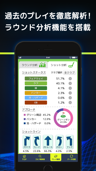 クラブごとに飛んだ距離を気温や気圧、高低差を考慮して測定してくれます。本アプリで計測したデータは自動的に分析され、プレーヤーの平均飛距離として記録。利用回数が増えるほど自分の予想飛距離がわかりやすくなります。
