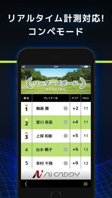 コンペモードでは、参加者全員のスコアやショットデータをリアルタイムで共有可能。ショットラインやボール状態も記録でき、別組でプレーしていてもほかの人の状況を把握できます。自分と相手の状況を逐一知れるため、コンペをより熱い戦いにできるでしょう。