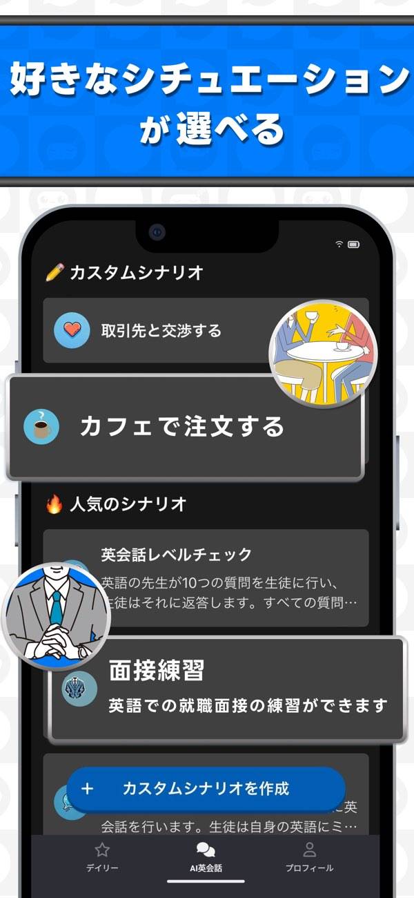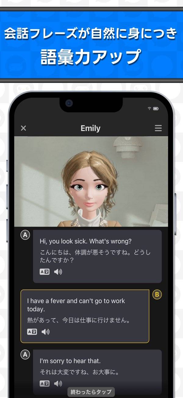 AI講師と話しながら、英会話を身につけられる学習アプリ。大きく分けて日常会話、ビジネス会話の2種のカリキュラムを選択でき、自分のレベルに沿った問題に取り組めます。