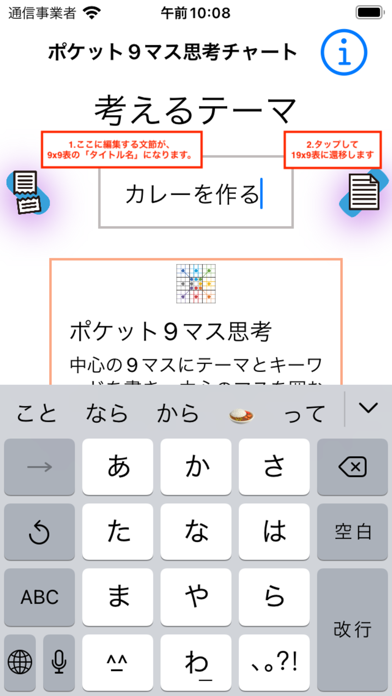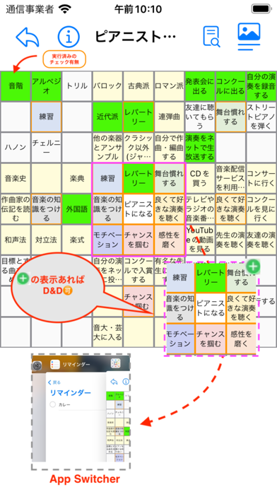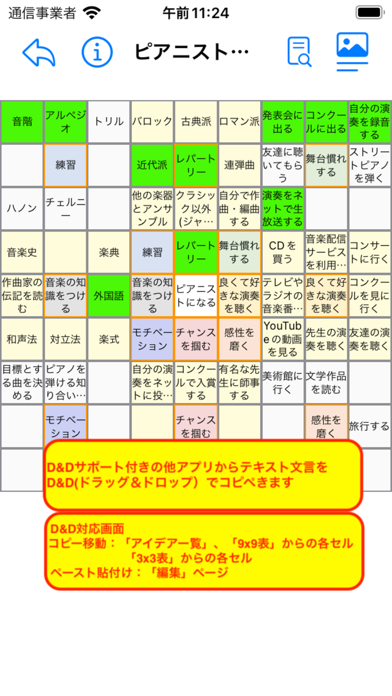 目標までにやることを9マスのシート内で細分化。大きな目標を達成するための小さな目標を、さらに9マスのシートで内容を細かく書き込めます。例えば「ピアニストになる」が大きな目標なら「舞台慣れする」という小さな目標の中に「友達に聞いてもらう」という内容を追加できます。
