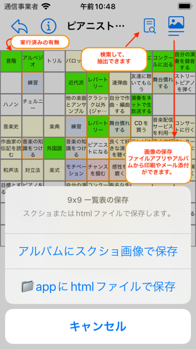画面右上にあるアイコンから、html形式、またはスクショ画像でシートを保存できます。PCに共有したい場合はhtml形式で保存。スクショ画像はスマホの壁紙に設定すると、目標をいつでもしっかり意識できます。
