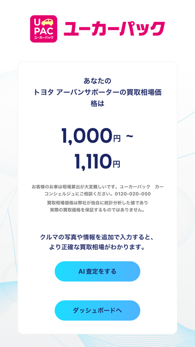 いずれ来る車の買取に備え、用意しておきたいこのアプリ。車買取オークションを展開する「ユーカーパック」の公式アプリです。AI査定を用い、現在の買取予想額を算出可能。そのまま売却相談まで行えます。