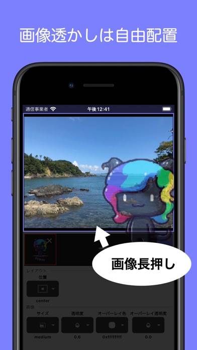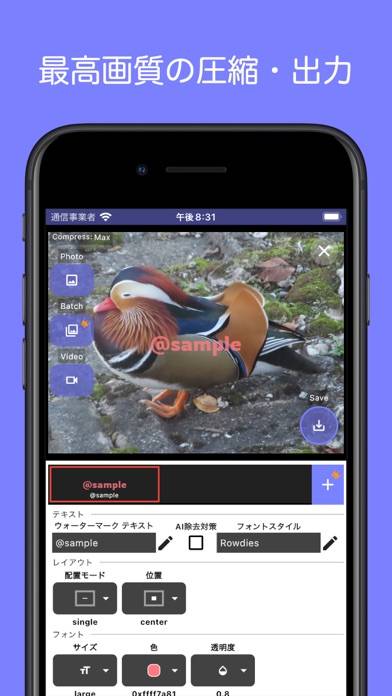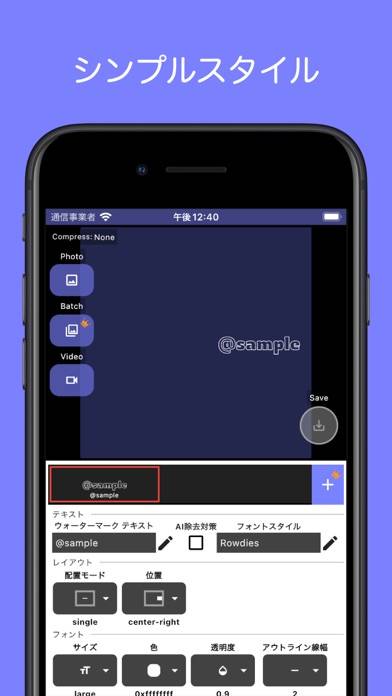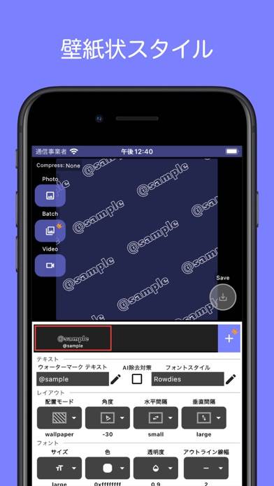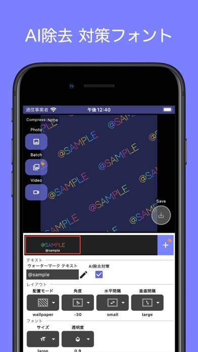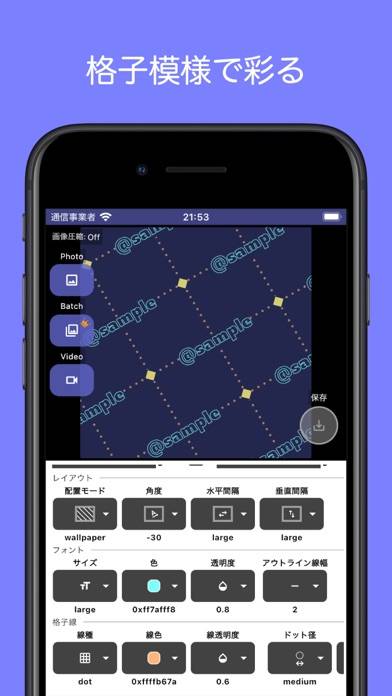 画像や動画に文字のウォーターマークを重ねられるアプリです。単発の文字入れと、画面いっぱいに敷きつめる壁紙スタイルに対応し、カラー・サイズ・密度・透明度や中抜きも細かく調整可能。500以上のフォントが登録されているので、写真やイラストの雰囲気を崩さずに作品を守れます。