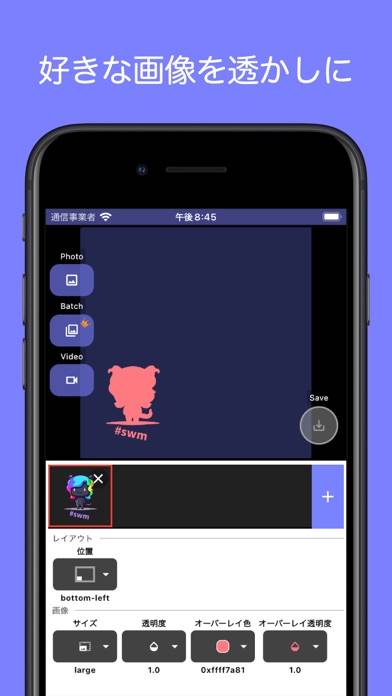 自作のイラストや自分で撮影した写真などに張り付けられるウォーターマークを簡単に作れます。1箇所のみに追加できる「single」、画面全体にパターン模様のように追加できる「wallpaper」の2種類あり、それぞれフォントや配置の変更が可能。アプリ上でウォーターマークの貼り付けができ、サイズも画像や動画データに合わせて自動調整されます。