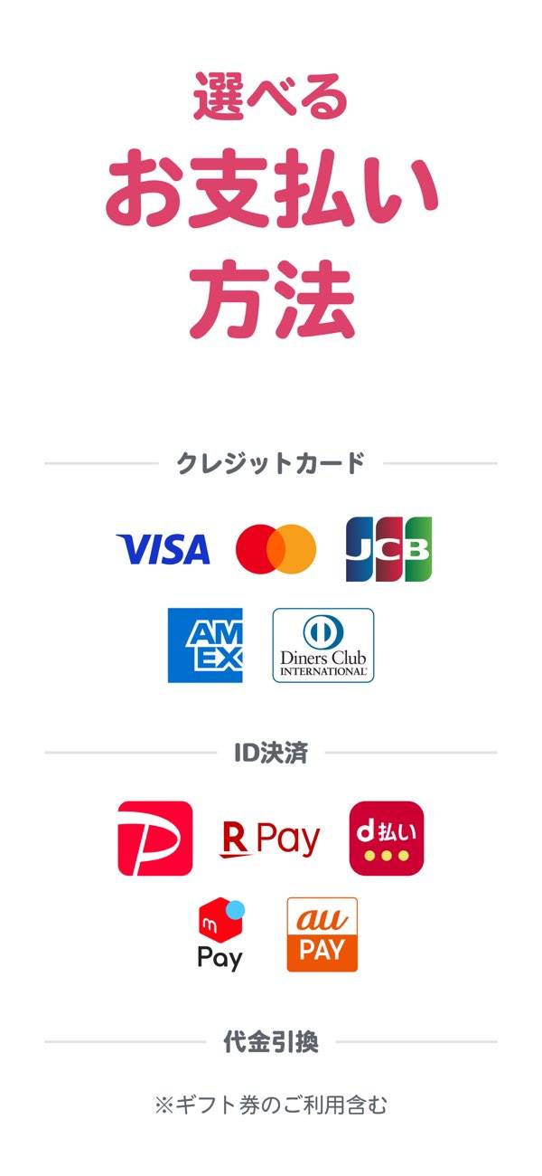| 支払い方法 | クレジットカード └Visa、マスターカード、JCB、アメックス、ダイナーズクラブ ID決済 └PayPay、楽天Pay、d払い、メルペイ、LINE Pay 代金引換 |