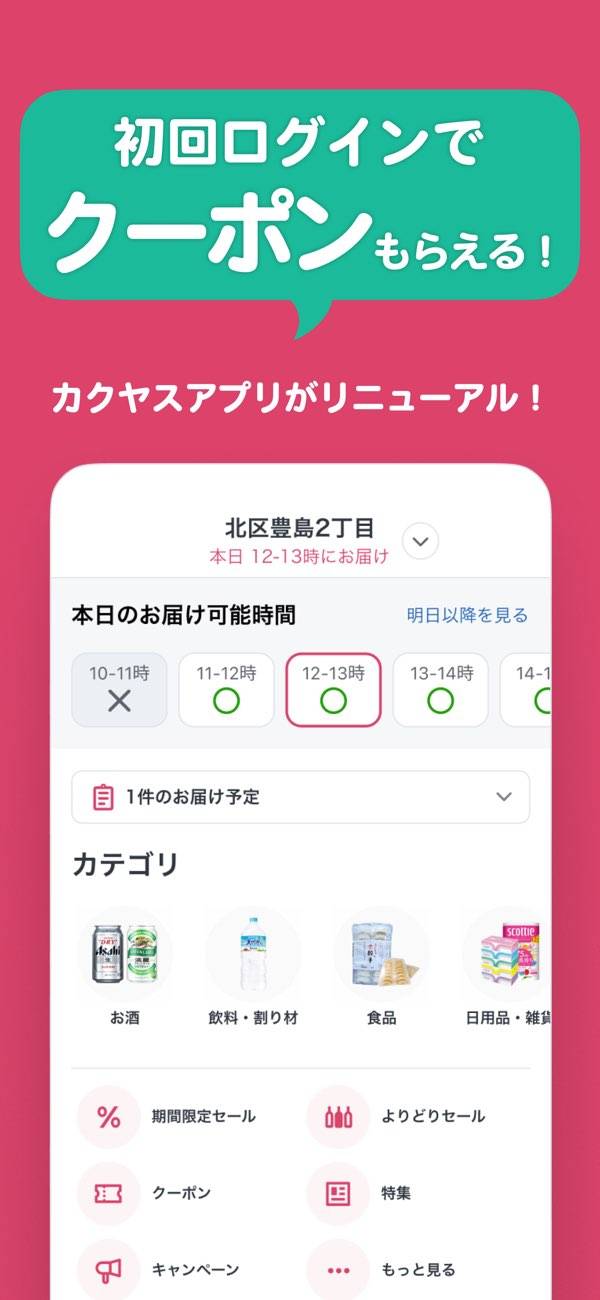 一方で『カクヤス』では記事執筆時点ではそのようなプランはなく、サブスクの加入に惑わされず無料でアプリを利用できます。最短1時間の配送や、冷やしサービスも無料です。