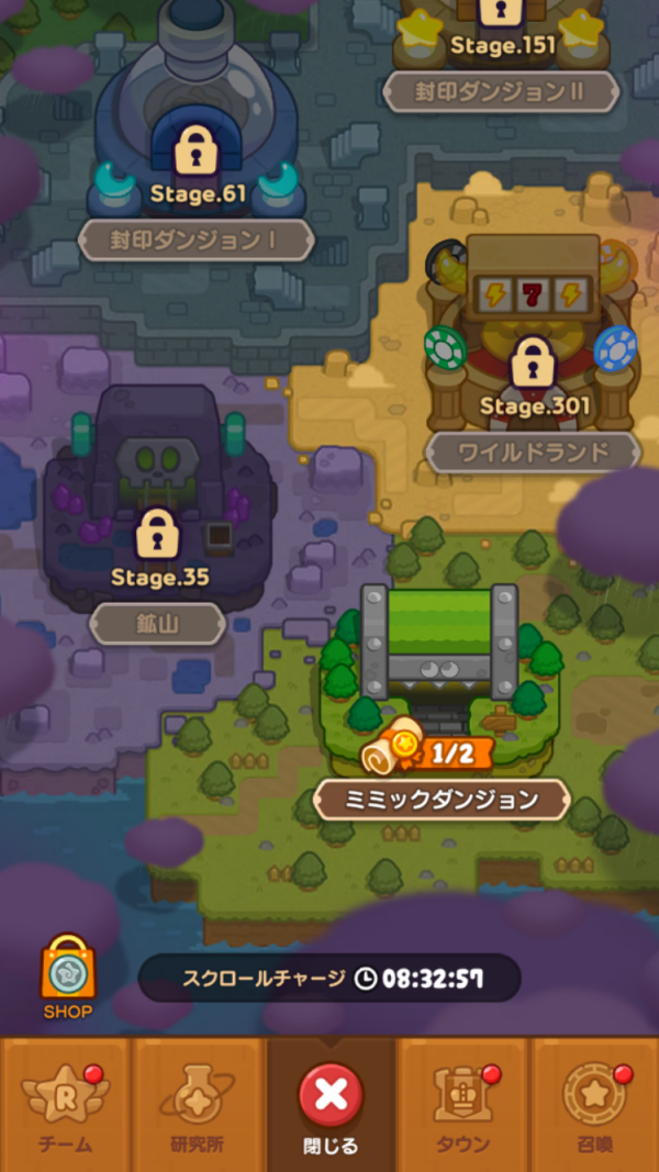 ある程度ゲームが進行するとダンジョンが開放されます。最初に開放されるミミックダンジョンではコインとレンジャー育成に必要な「EXP缶」を収集可能。周回数には制限がありますが、動画広告を見ると追加で周回できるようになります。