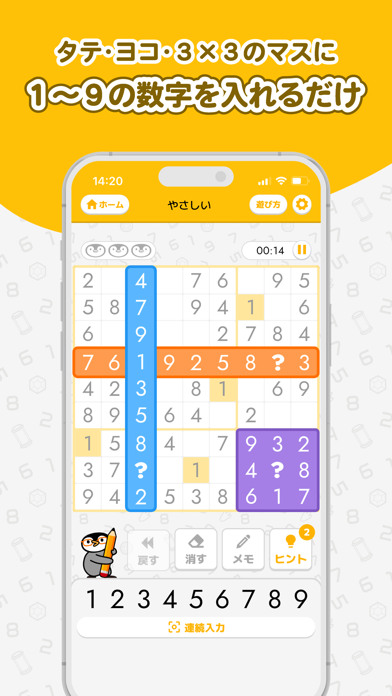 パズル初心者でも挫折しにくい、充実のサポート機能を搭載しています。そもそもナンプレとは、9×9のマス目の縦列・横列・3×3の各ブロック内に1から9までの数字を重複なく入れていくパズルゲームです。
