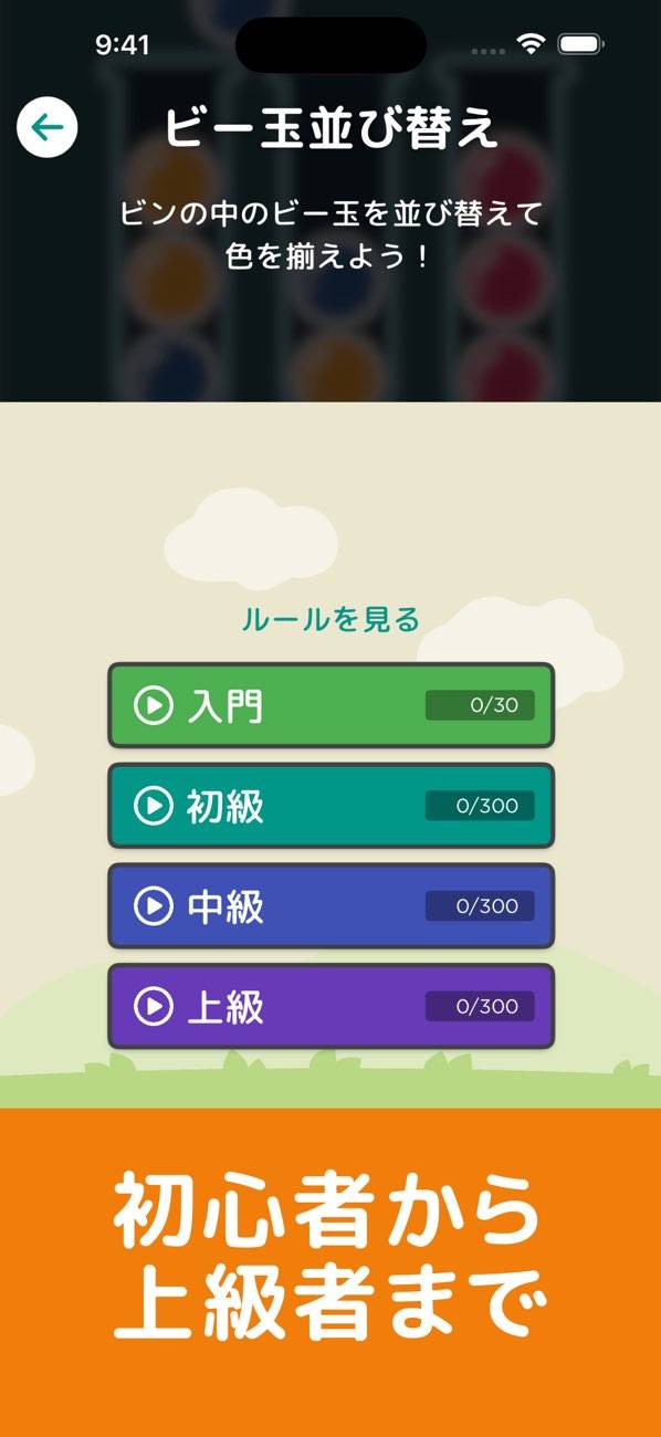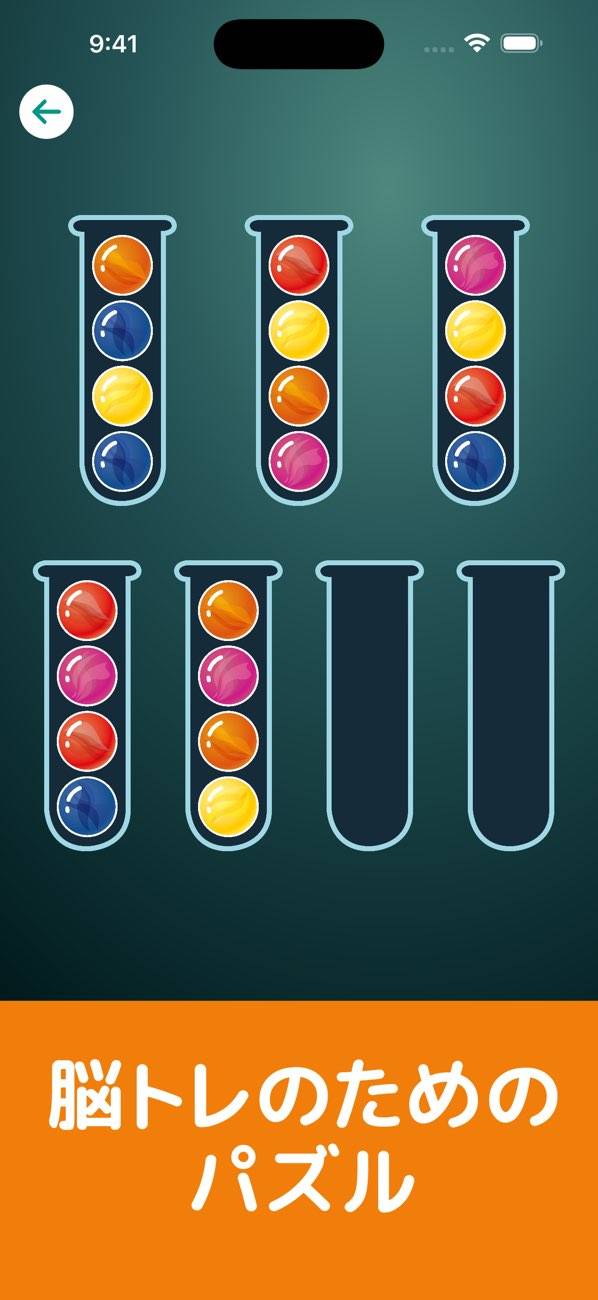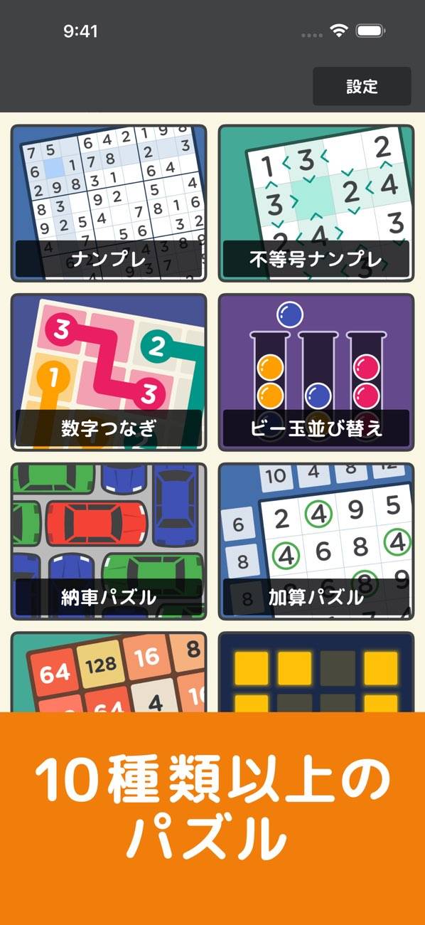 ナンプレ、ビー玉並べ替え、納車パズルなどがひとつになったアプリ。全12種のパズル一覧の中から好きなものを自由に選択して遊べます。難易度も入門、初級、中級、上級の4種が用意されており、ステージ数も150~300と多く遊び応え満点!