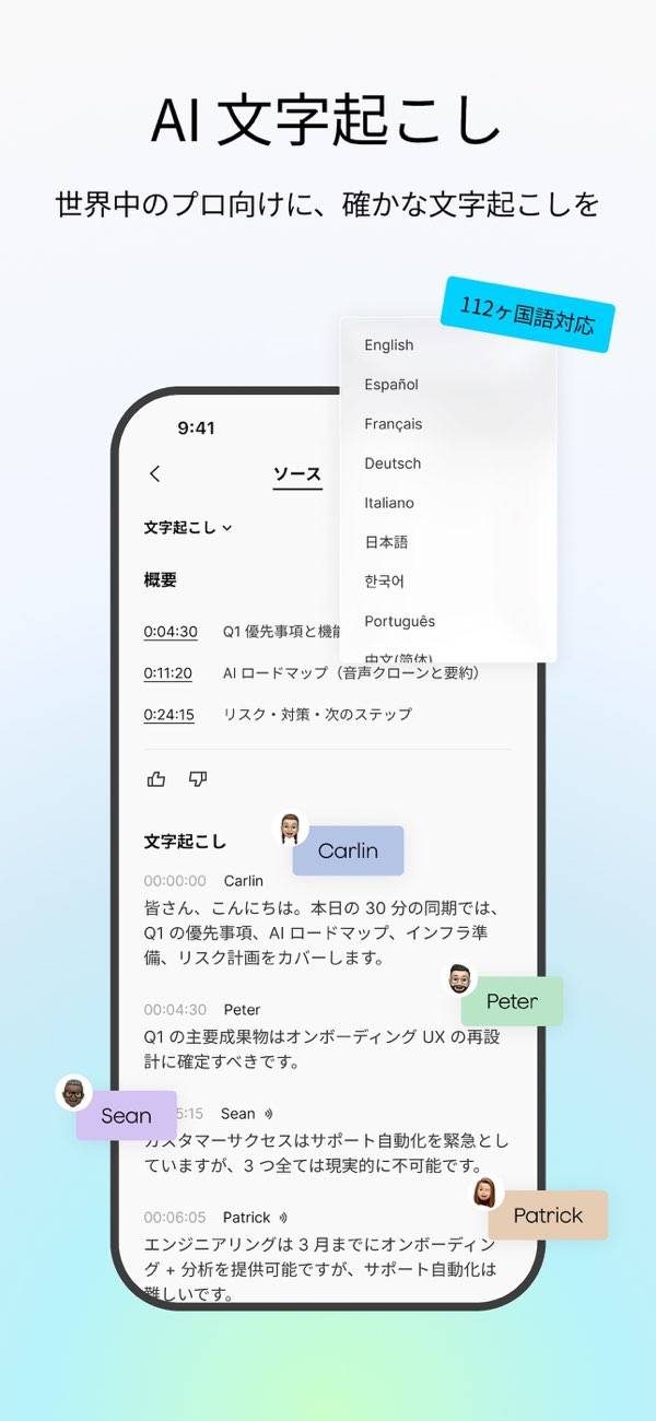 PLAUDデバイスで録音した内容を、自動で文字起こしできます。インタビューなどの内容を原稿に起こしたいときにも、手動で文字起こしする手間を省けるでしょう。文字はおおまかな発言ごとに区切られ、各発言をタップしてスムーズに録音を再生できます。