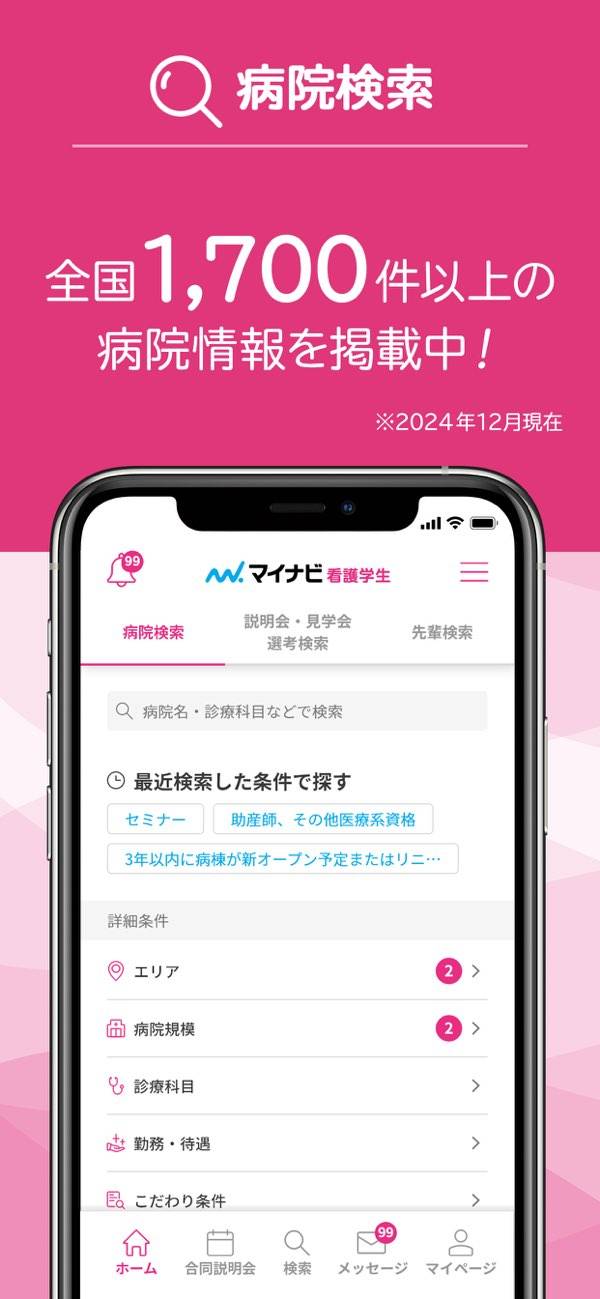 日本全国の病院で開かれている説明会・見学会などの情報が検索できます。エリアを絞り込むだけでなく、病院規模や診療科目、待遇といった条件を細かく絞り込みが可能。自分にあった働きやすい職場を見つけられるようアプリがサポートしてくれます。