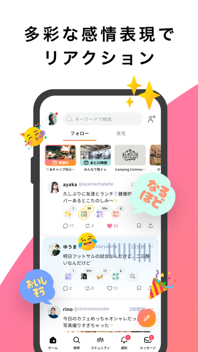 気軽なやりとりができるのもうれしい点。ポストに対しては、テキストの返信のほかに「リアクション」でスタンプを送る方法もあります。繊細な人の場合、たとえ挨拶程度でもどんな返事を送るか悩むこともあるでしょう。リアクションならカジュアルに感情を伝えられます。