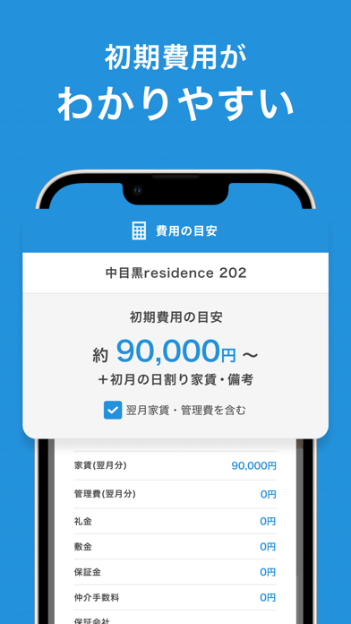 何より初期費用の目安をワンタップで確認できるのもありがたいところ。あくまで目安ではありますが、いざ契約をしたら思ったより高くついてしまった、という事態を防げるようになっています。