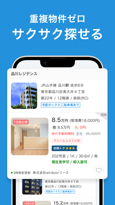 『エアドア』は株式会社エアドアが提供する賃貸検索アプリです。2025年8月現在、対応地域は東京・神奈川・千葉・埼玉。全物件を毎日更新し、おとり物件はゼロ。更新時間や募集状況までわかり、気になった部屋は内見予約や入居申込までスマホで完結します。