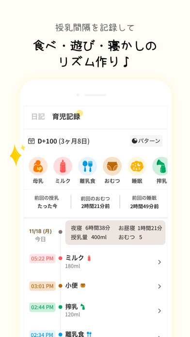 | 記録項目 | 授乳・ミルク、離乳食、排泄、睡眠、日記 |