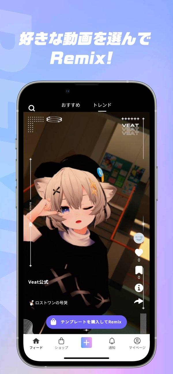 フィード画面に流れるほかユーザーの動画を選んでリミックスできます。アバターの変更はもちろん、背景やエフェクトなども自由にカスタマイズ可能。詳細にカスタマイズできるので、リミックスでもオリジナリティを出せます。