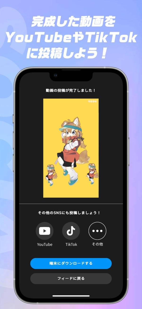 - 完成作品はアプリ内共有やダウンロードが可能。SNSでの活用も自由自在