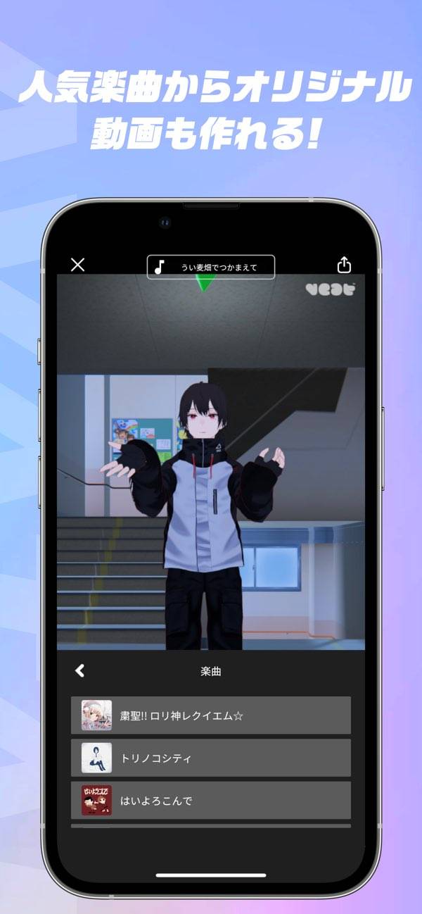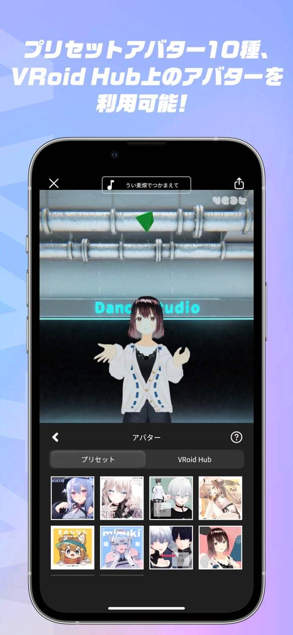 ショート動画で人気の楽曲に加え、お気に入りの曲をインポートもできます。さらにアバターは基本の10種類に加え、VRoid Hubと連携することで自作アバターも使用可能です。好きな曲と自作アバターで、完全オリジナルのダンス動画を作れるのが魅力。