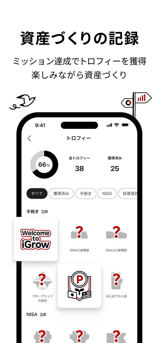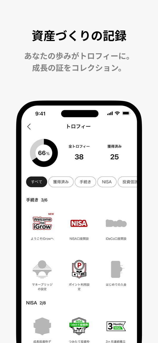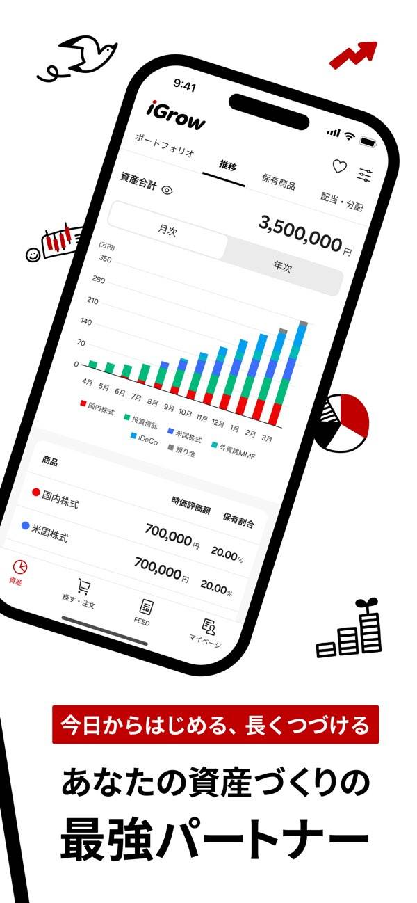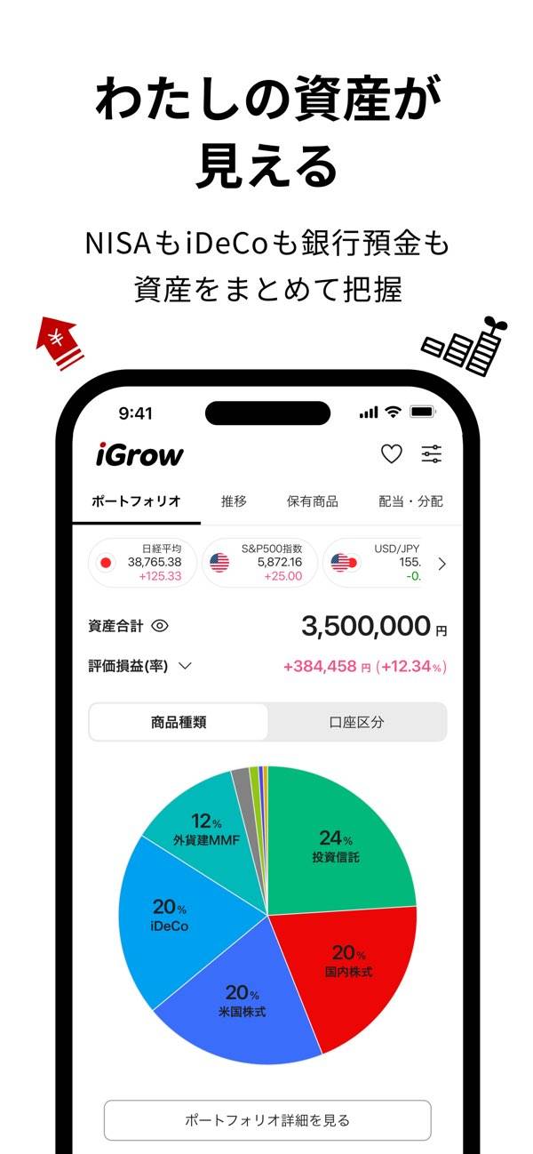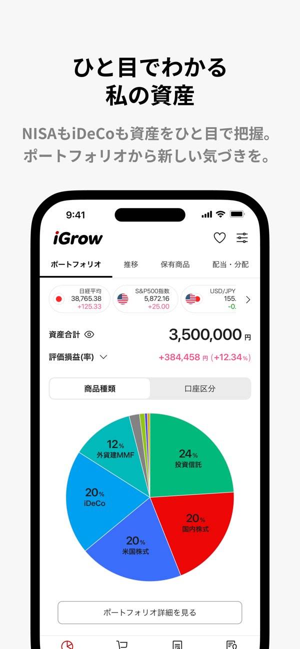 アプリを開けば、登録してある金融資産を円グラフで表示。利用状況や商品別の保有状況を視覚的に確認できるため、資産状況を把握しやすいです。投資開始からの資産推移も一画面で表示され、運用成果を実感できます。