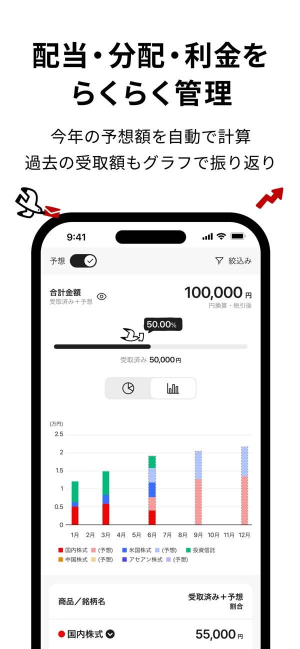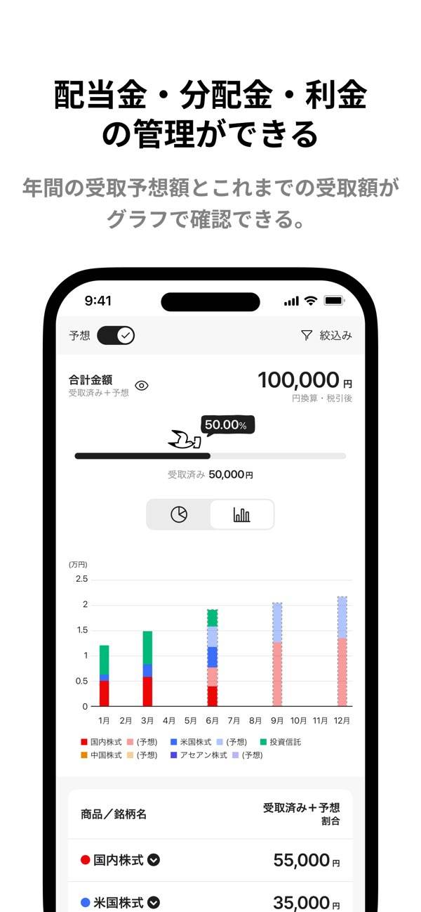 ブラウザの楽天証券だけでは把握しきれなかった資産が、iGrowならひと目で整理できるのが気に入っています。特に配当・利金の受取履歴と年間予想額が見られるのは非常に便利で、月ごとのグラフも直感的。普段は投信やNISAを中心に運用しているので、必要な情報がスマホだけで完結するのは助かります。