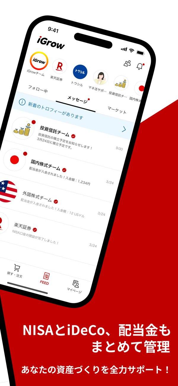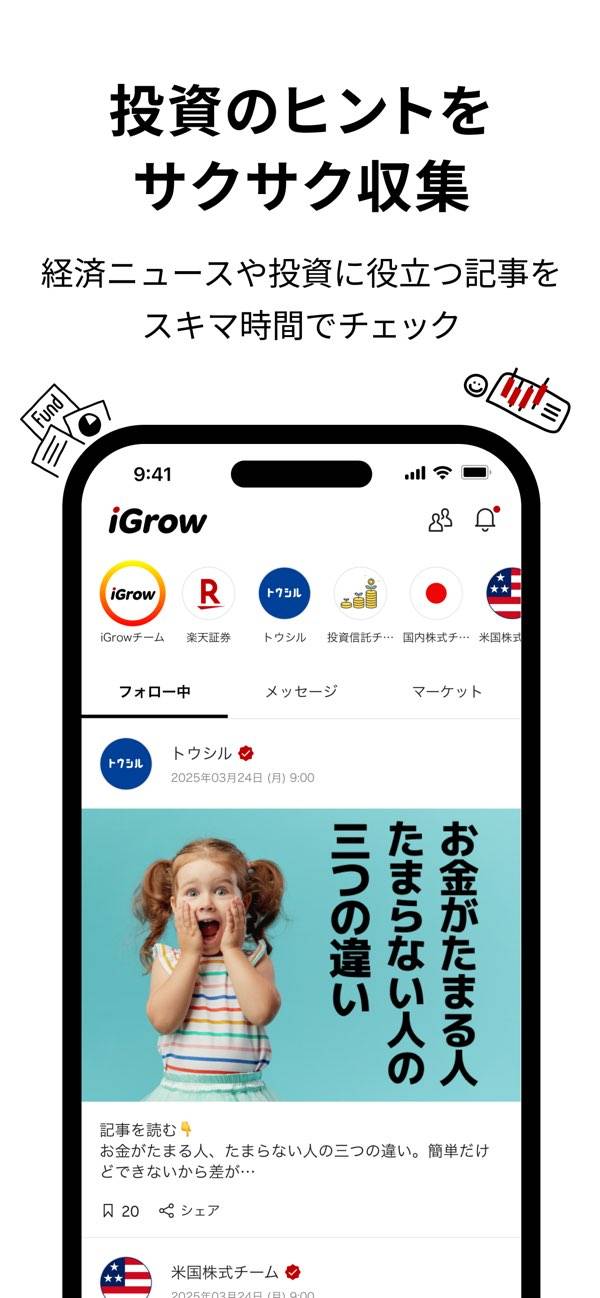 投資系の記事や経済ニュースを配信するアカウントをフォローして情報収集が可能です。積立予定日や配当金入金のお知らせも届くため、投資に関する情報をスムーズにチェックできます。