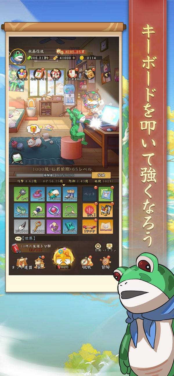 オートで進む戦闘と“キーボードを叩く”修行が融合したオートバトルRPGです。舞台はインターネットの世界。インフルエンサーのカエルや絶叫ニワトリ、紳士シマウマなど、個性が渋滞する動物たちとともに、キーボードクラッシャーとして強さを磨いていきます。