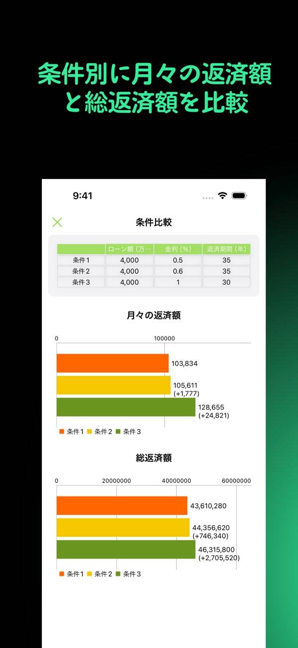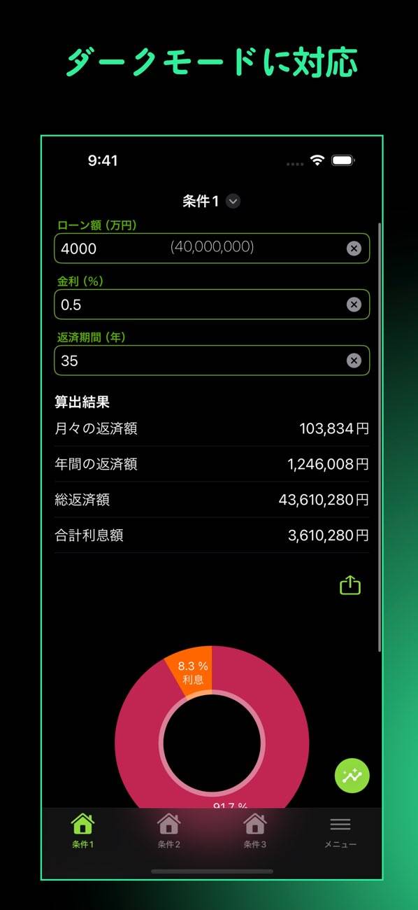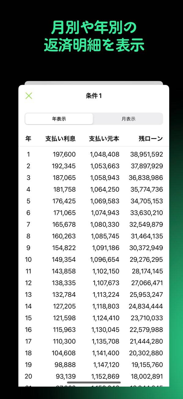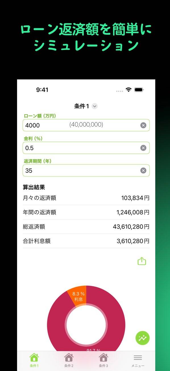 元利均等方式でローンの返済額を計算できるシミュレーションアプリです。わずか3項目の入力で月々の返済額から総利息まで瞬時に算出し、結果をグラフでわかりやすく表示。さらに複数の条件を比較検討できるため、ローンを組む際の比較検討時に役立ってくれます。
