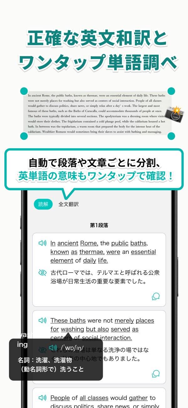 英文を撮影すると、そのまま日本語訳が表示され、文の意味がすぐにわかります。長文内の知らない単語もタップするだけで意味を調べられるので、辞書アプリを開く手間もなし。