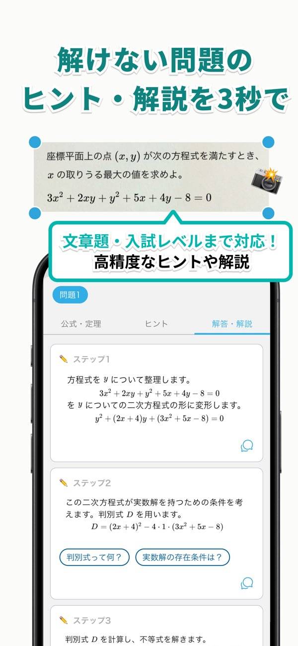 - スマホで撮るだけで問題に合わせたヒントや解説がすぐ表示