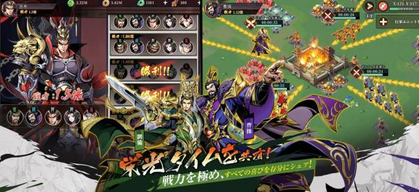 さらにバトルでは、この2Dイラストの武将たちが躍動。呂布の方天画戟が閃く瞬間、周瑜の計略が炸裂する瞬間、そのすべてが贅沢なエフェクトで彩られています。画面全体に広がる派手な演出は、まるでアニメの名シーンを見ているかのような興奮が得られるでしょう。