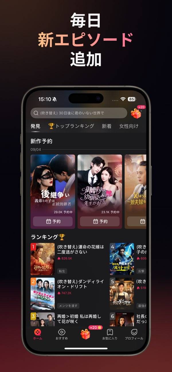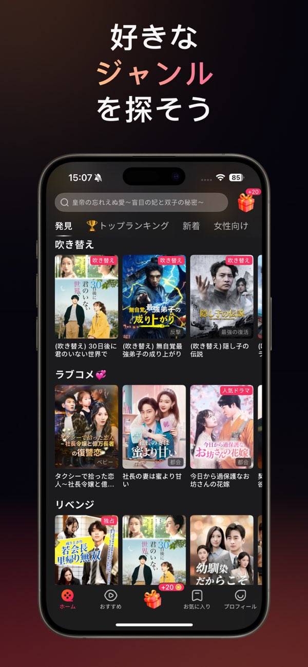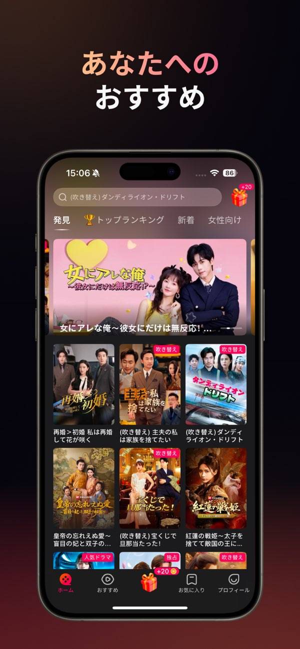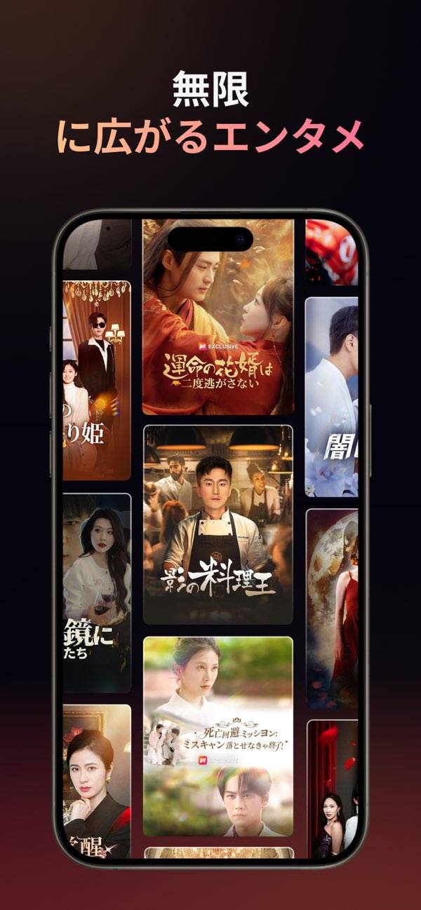 主に中国圏のショートドラマに特化した動画配信サービス。恋愛や復讐劇・ファンタジーといったジャンルのドラマを、1話約3分ずつに分けて楽しめます。基本は無料で観られ、後半の話数は有料という仕様。ですがログインボーナスで有料話を購入できるので、最後まで観るのに支障はありません。