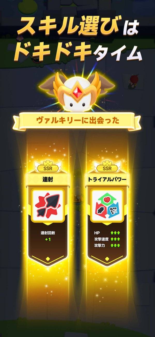 - レベルアップごとにランダムで強化効果を獲得。毎回違った性能で遊べる