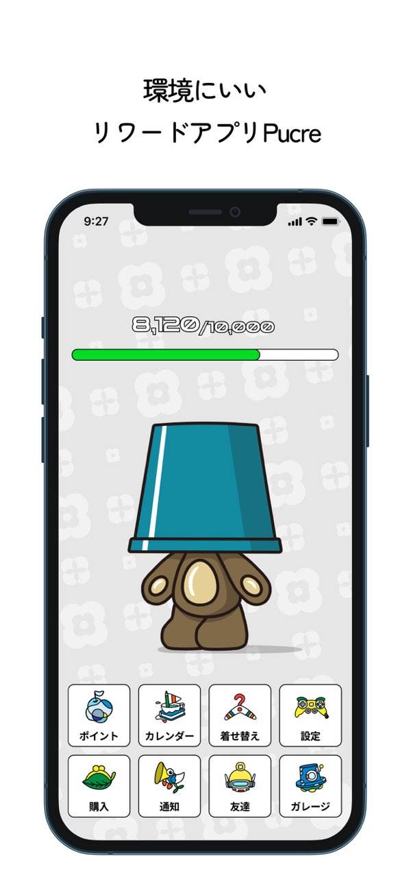 - バケツ型の個性的なキャラと共にポイ活を頑張れる。着せ替え要素あり