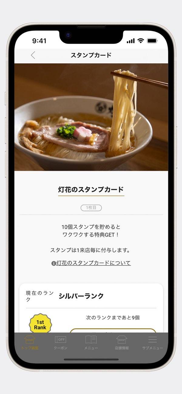- ランクアップで特典が豪華になるスタンプカード機能を搭載