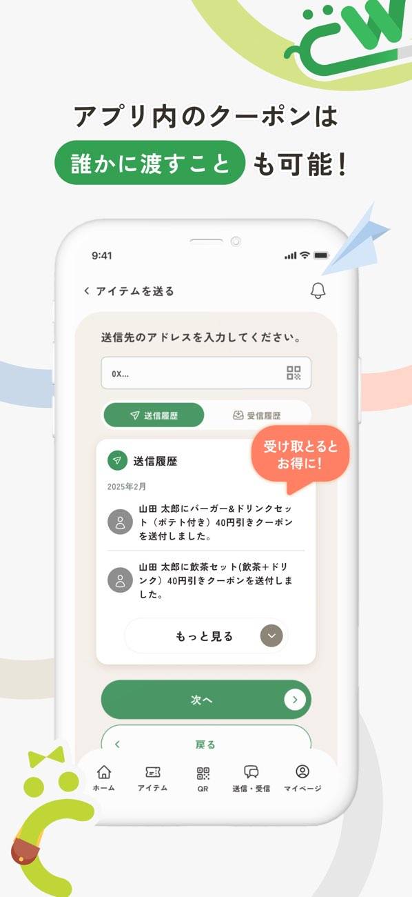 クーポンやチケットは、自分だけのものにとどまりません。使う予定がないものはアプリから簡単に送ることができ、家族や友人にも届けられます。たとえば週末のお出かけ用チケットを、実家の両親に送ってみるなど使い方はさまざま。手間もかからず、ちょっとした気遣いを形にできます。