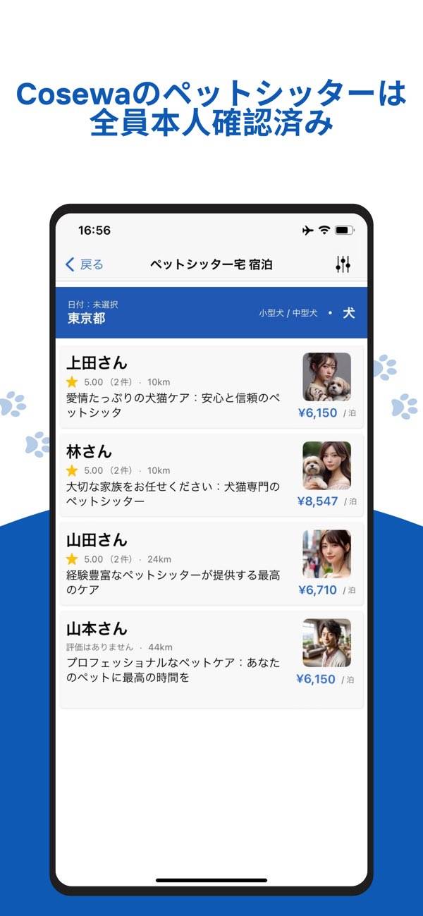 インターネットの検索感覚で、条件に合うペットシッターが見つかります。犬or猫、ペットシッター宅or飼い主宅、面倒を見てほしい日付、位置(住所)を入力すればOK。候補となるペットシッターが一覧で表示されます。