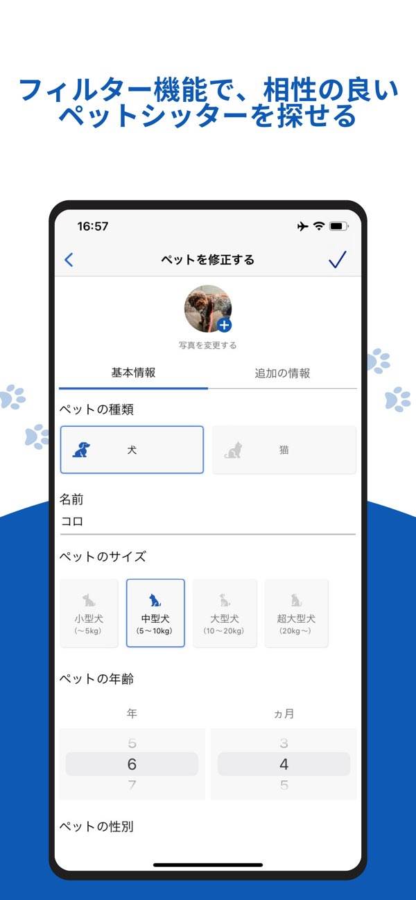マイペットの情報の入力もしっかり行いたいところ。年齢、去勢の有無、1日の食事の回数、動物病院の情報など多数の入力欄が用意されています。細かい情報がそろっていれば、シッターもお世話しやすくなり、何よりペットも過ごしやすくなるでしょう。