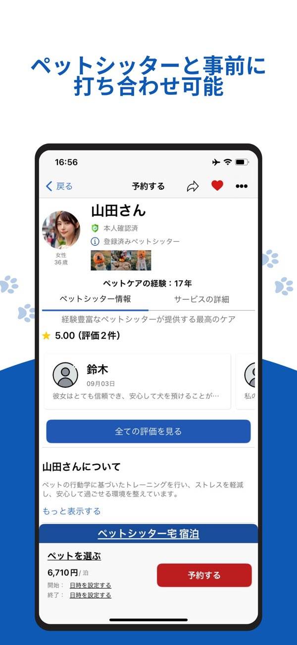 各ペットシッターごとの詳しい情報も掲載されています。ペットケアの経験年数、略歴、スキル、動物との接し方などさまざま。獣医大在籍経験あり、ペットショップで職歴ありといった経歴のシッターもおり、信頼できる人が見つかるまで十分に吟味できる環境が整っています。