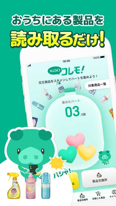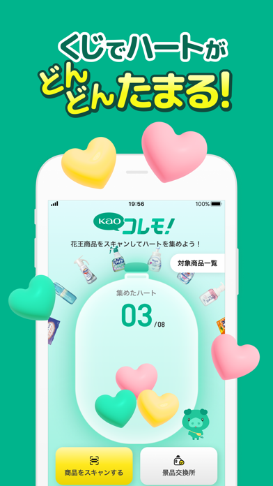 - 写真撮影とくじの当選でハートをゲット! 6つで花王製品と交換可能