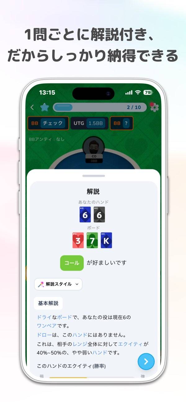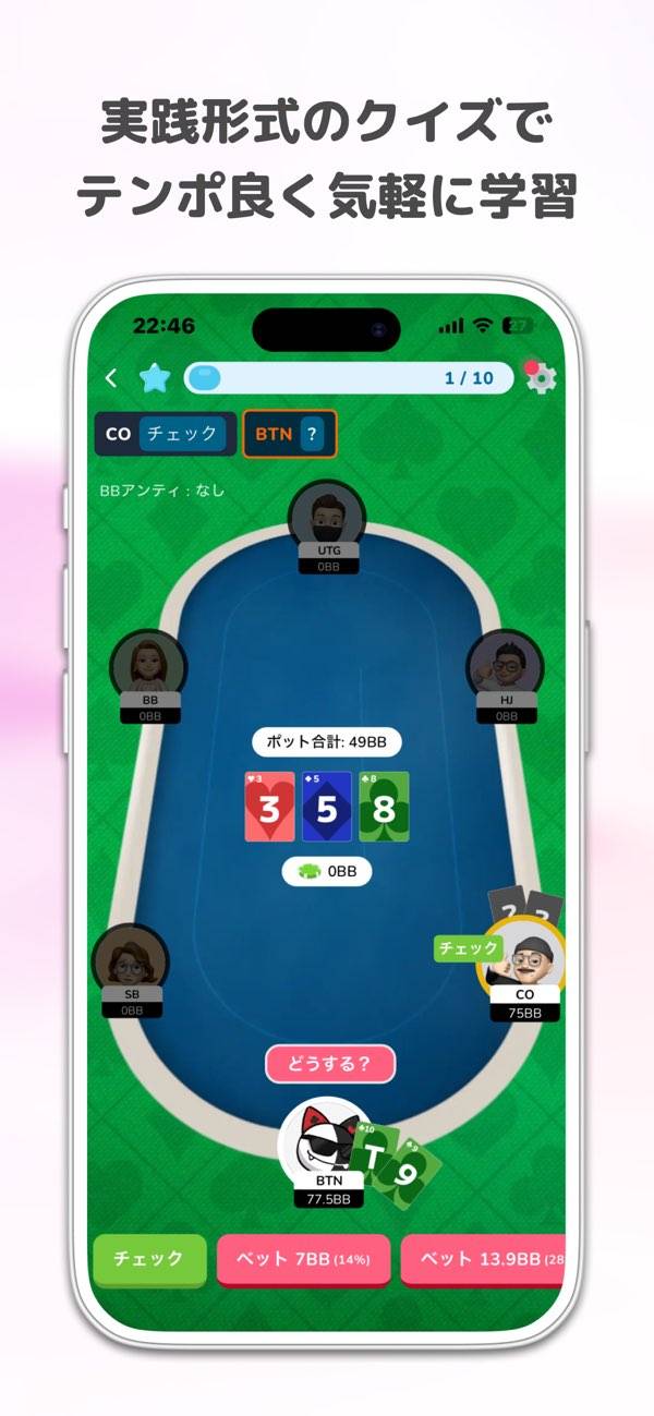 ポーカーでよくある場面を、気軽に練習できるのが魅力。「プリフロップでレイズすべき?」「このフロップでベットを打つ?」など、実践さながらのシチュエーションで反復練習できます。初めは基本的なハンド選択から始まるため、焦らず着実にスキルアップ可能です。
