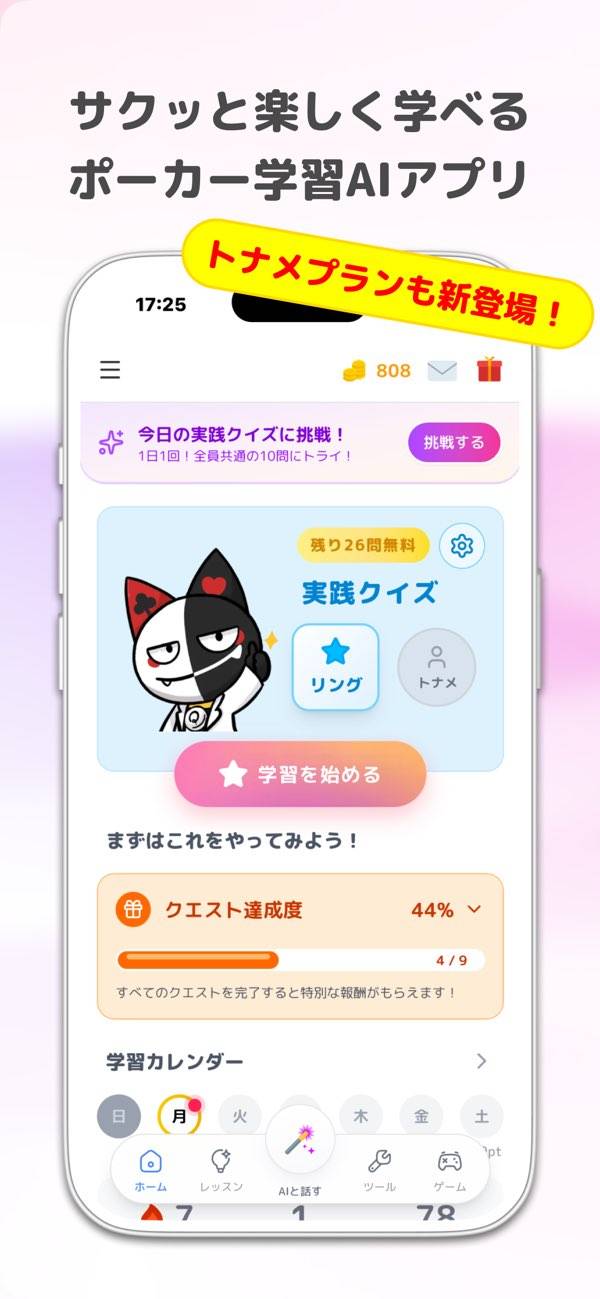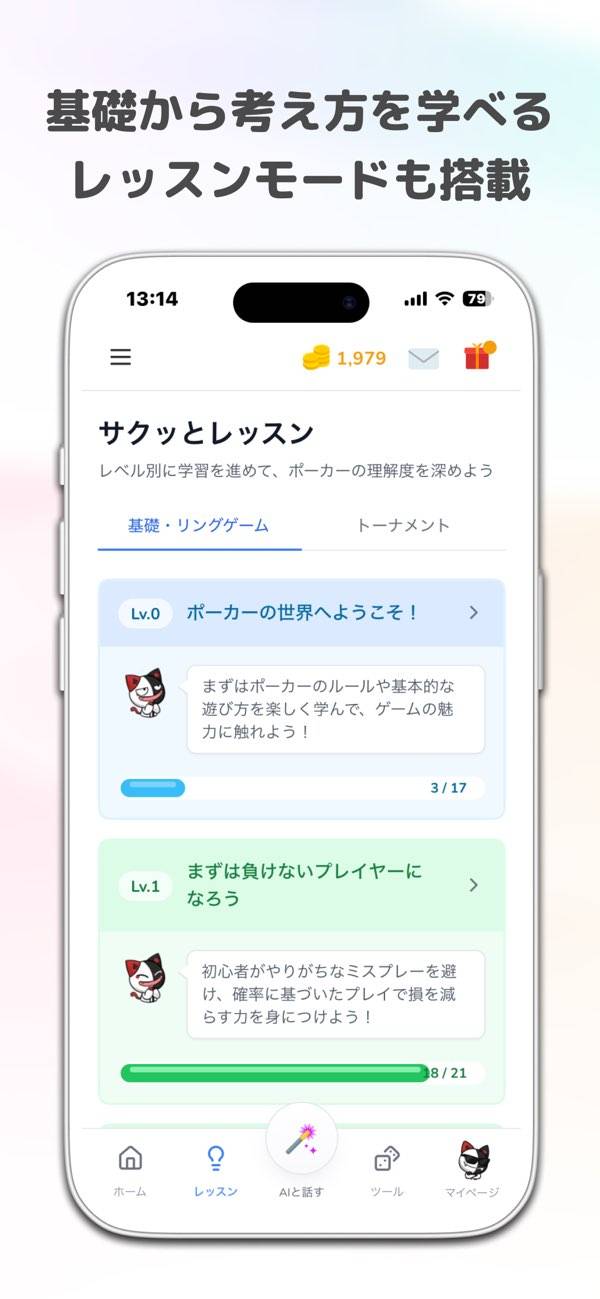 東大出身のAIエンジニア達が作ったポーカー学習アプリ。ポーカーを始めたばかりの初心者から、ちょっと慣れ始めてきた中級者まで、丁寧な解説をもとにレベルアップを狙えます。ハンド選択からアクション判断まで、実践で迷いがちな場面を解説付きで練習可能。