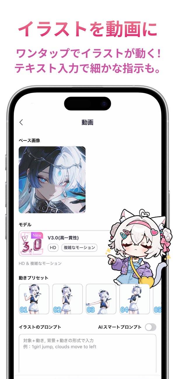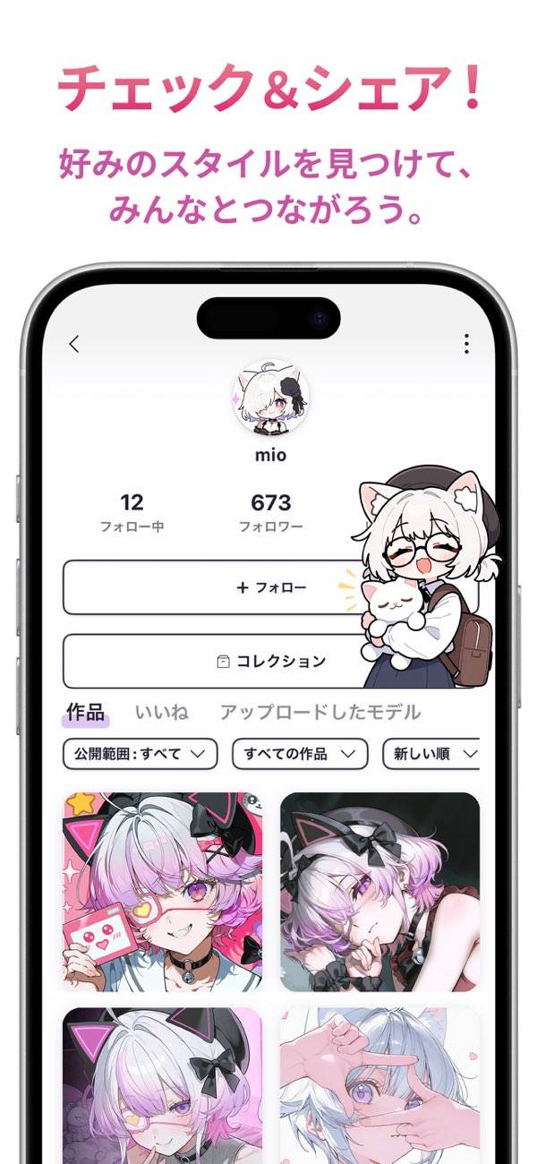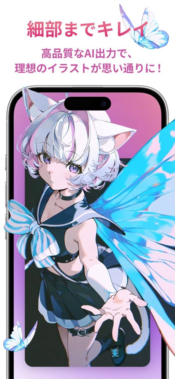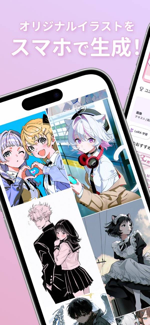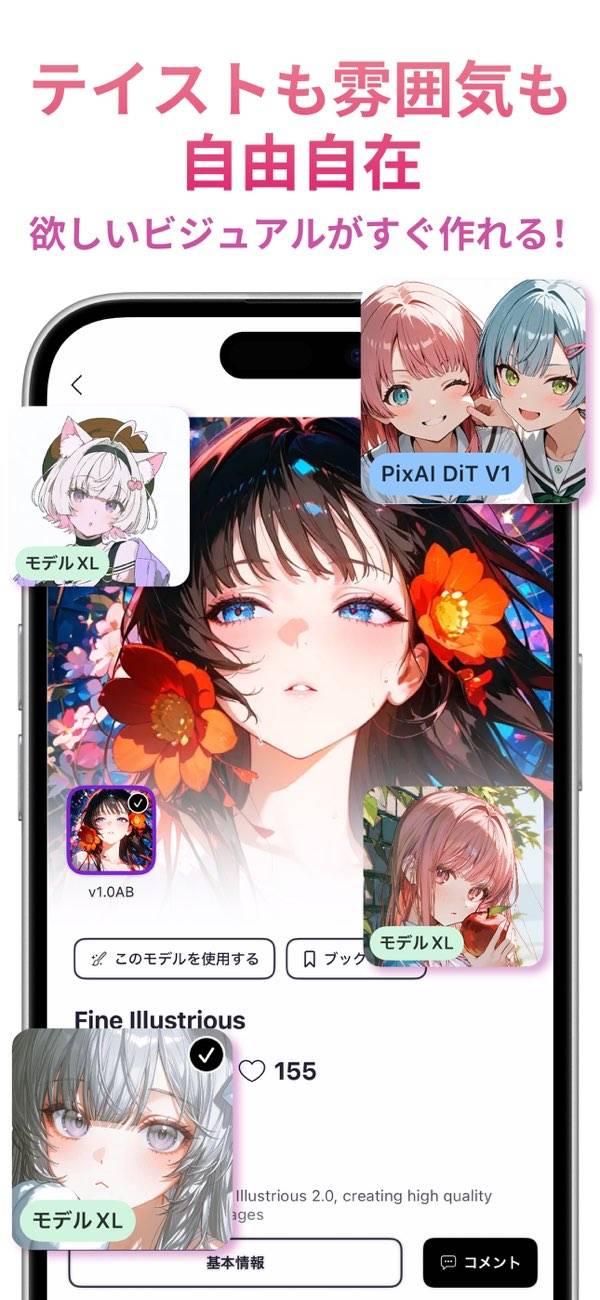 プロンプト(テキスト)から画像を作れる、イラストに特化したAI生成アプリ。モデルとスタイルの2要素を指定し、狙った雰囲気や画風でキャラクターのイラストを生成できるのが特長です。生成1回ごとにクレジットを消費する仕組みですが、無料でも毎日数回分のクレジットがもらえるため、気軽に使っていけるでしょう。