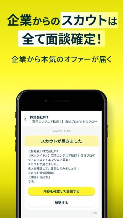 20代の転職活動を支援する、求人面談サービスです。面談ごとに現金報酬が得られ、転職への一歩を後押しする仕組みです。履歴書不要で日程調整も簡単、スマホ1つで始められる手軽さも魅力。さらに条件のミスマッチを防げたり、企業からの本気のスカウトのみを届けてくれたりと機能面も充実。転職の効率化を図れます。