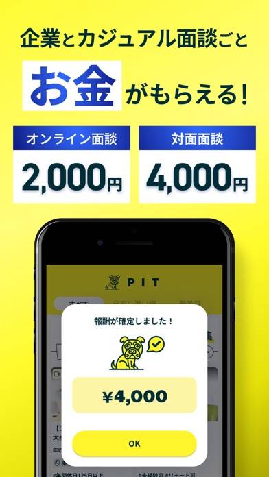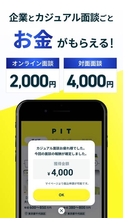 面談1回ごとに報酬が発生し、オンラインで2,000円、対面で4,000円を獲得可能。面談後の簡単なレポートを提出すると、報酬が獲得できます。さらに本アプリのスカウトは面談確定の企業からのみ届くため、確実に報酬がもらえる点も魅力的です。