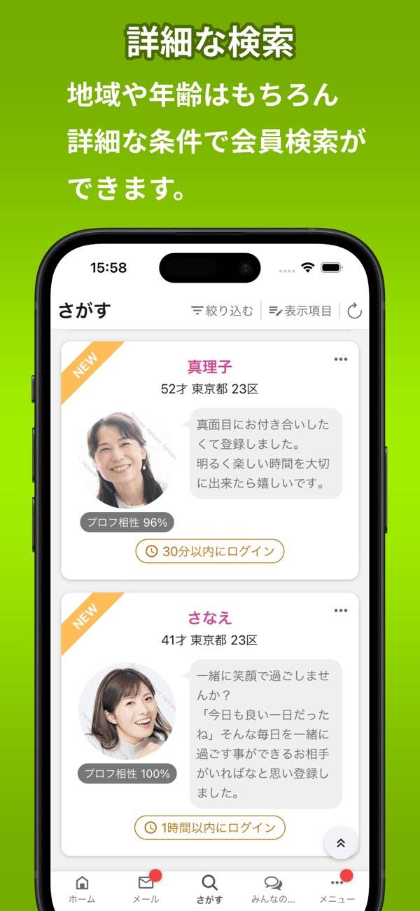 | 主な絞り込み条件 | 年齢、現在地からの距離、居住地、世帯構成など |