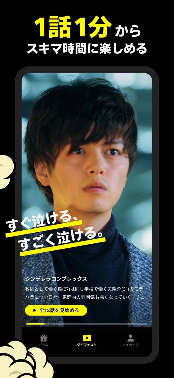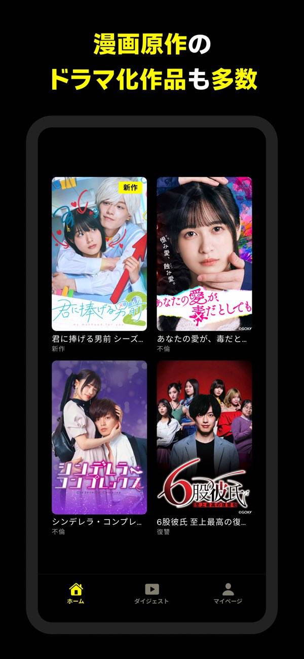ホーム画面からショートドラマの一覧が見られ、気になる作品をチェックできます。一度でも観た作品はホーム画面の「視聴中ドラマ」に登録されるので、再度探さなくても見やすいのが特長。スキマ時間に作品を見て、いろいろな愛のかたちを体験しましょう。