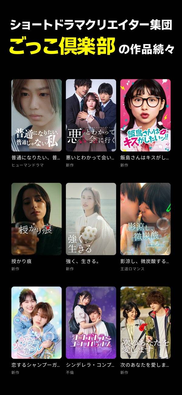 『YouTube』や『TikTok』で人気のクリエイター「ごっこ倶楽部」の作品が満載。1話1~3分程度で見られるショートドラマが多数収録されています。