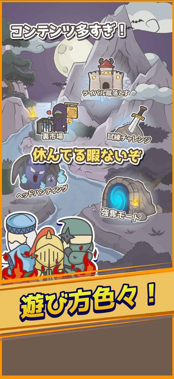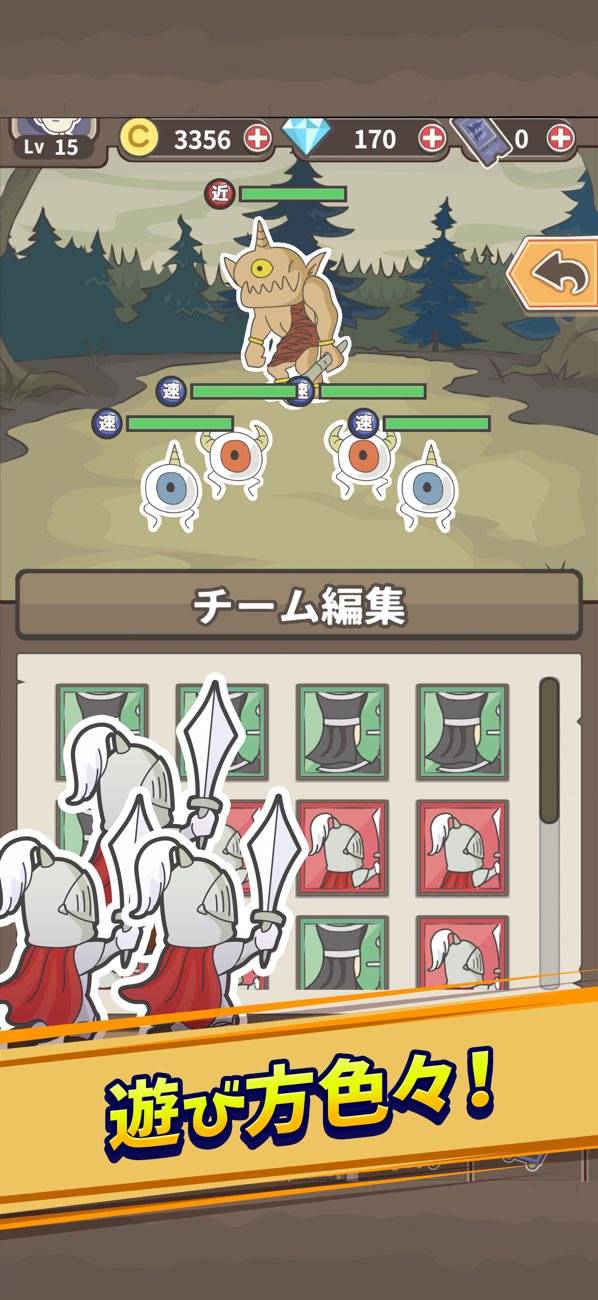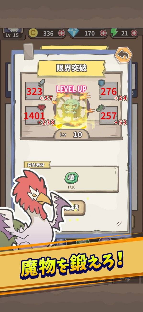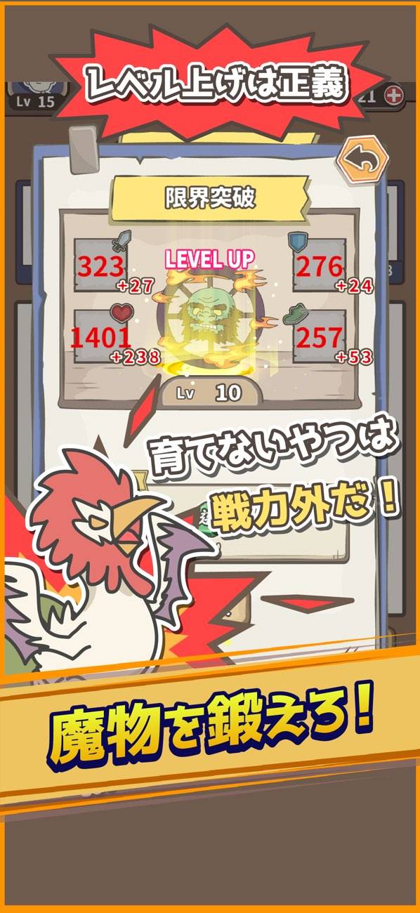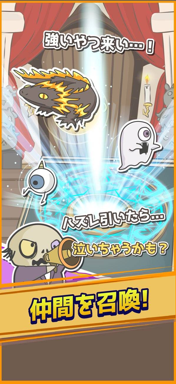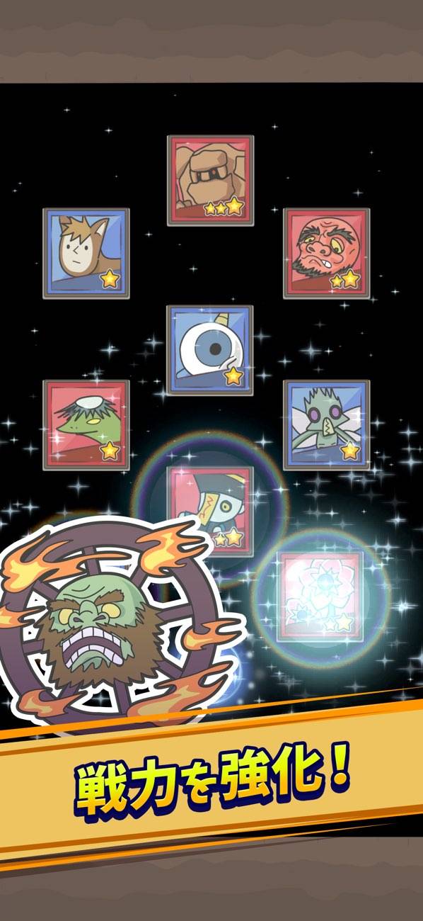 リクルート(ガチャ)で手に入る魔物たちも一癖あり。心のリハビリ中の落ち武者、泣くと非常にうるさいマンドレイクなど、ちょっとした自己紹介がおもしろいです。魔物たちの強化要素ももちろんあり、レベリングやスキル強化などで育成できます。