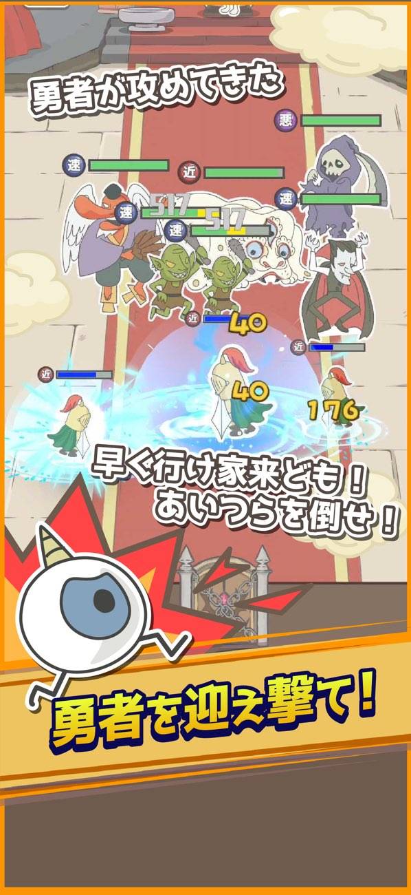 最弱の魔王がたくさんの魔物を雇って戦うタワーディフェンスゲーム。ゆるいタッチで描かれた魔王と魔物たちが特徴で、白熱するはずのバトルもどこか締まらないシュールな雰囲気です。