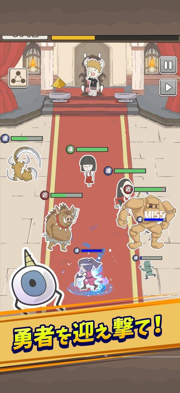 最大5体の魔物を配置してバトルスタート。あとは自動で魔物たちが、迫りくる勇者たちと戦ってくれるのでらくちんです。「近」「遠」といった5種類の属性や、必要に応じて魔物を動かす、程良い戦略要素もいい感じ。